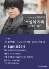 <´Þ·Á¶ó, ¾Æºñ>, <ħÀÌ °íÀδÙ> µîÀÇ Ã¥À» Æì³½ ±è¾Ö¶õ ÀÛ°¡¸¦ 9¿ùÀÇ °­»ç·Î ÃÊÃ»ÇØ  ¡®¼Ò¼³ÀÇ ÀÚ¸®¡¯¶ó´Â ÁÖÁ¦·Î ÀúÀÚÀÇ ÀÛǰ ¼Ó Àι°µéÀÌ ¸Ó¹°°í Áö³ª¿Â °ÅÁÖ°ø°£À» ÅëÇØ »îÀÇ Àǹ̸¦ »ý°¢ÇØ º¸´Â ÀÚ¸®°¡ µÉ ¿¹Á¤ÀÌ´Ù.